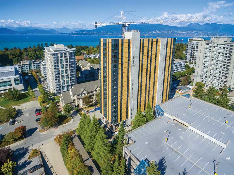 The school’s building requirements showcase the university’s commitment to sustainability. Wood, a renewable material, was chosen in part to reflect this commitment. The building was also designed to meet Leadership in Energy and Environmental Design (LEED) Gold certification. The project will be a living laboratory in which UBC faculty and graduate students, as well as architecture, engineering, and forestry practitioners, can collaborate with the school’s operational staff and industry partners on the design, development, and construction of other tall wood buildings. It represents yet another impressive wood structure on the school’s Vancouver campus, added to a list that includes the AMS Student Nest, Engineering Student Centre, Centre for Interactive Research on Sustainability (CIRS), Bioenergy Research and Demonstration Facility, and Earth Sciences building. (Previous Construction Canada articles on these projects include “Building the Earth Sciences Building at the University of British Columbia” by Eric Karsh, M.Eng., P.Eng., Struct.Eng, MIStructE, Ing. and “Think Globally, Act Locally: Net-zero Impact Development” by Blair T. McCarry, P.Eng., PE, ASHRAE Fellow, LEED AP. Articles on wood buildings on UBC’s Okanagan campus include “Constructing an All-wood Building: The Wood Innovation and Design Centre” by Werner Hofstätter and “Overcoming the Learning Curve: Design and Construction of the UBCO Fitness and Wellness Centre” by Patrice R. Tardif, LEED AP. Visit www.constructioncanada.net to read.)