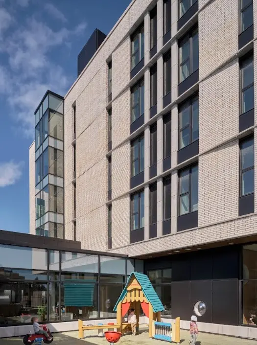A modern multi-story building featuring green roofs, large glass windows, and a mix of brick and contemporary design elements.