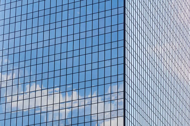 Modern building with a large glass facade and textured beige wall, set against a clear blue sky. Sparse landscaping in the foreground.