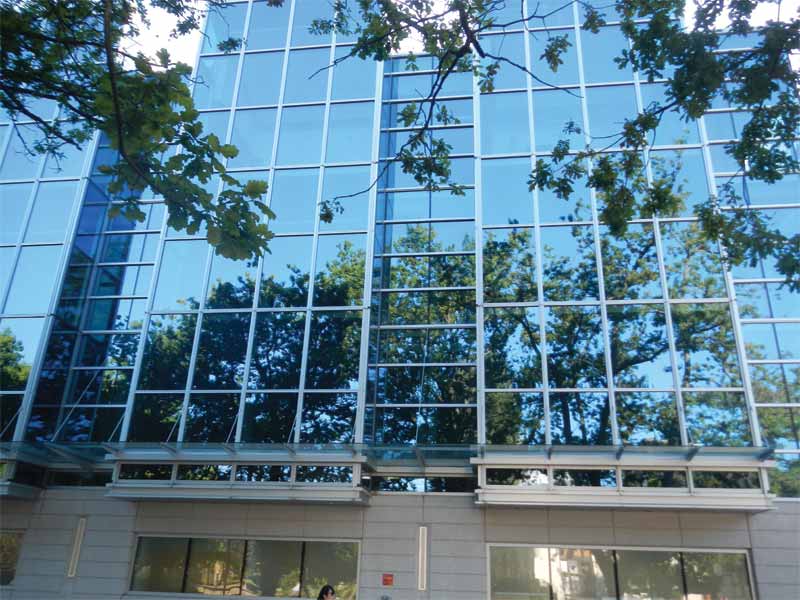 The height of marker treatment on any façade is critical. It must be 16 to 25 m (52.5 to 82 ft) above grade. The limits of treatment are associated with the prospective height of mature trees seen through or reflected off the glazing that provides an attractive illusion to birds. Exceptions to these limits occur when buildings are placed within ravines or at varying heights relative to different grades near bird-attracting vegetation seen through or reflected in higher heights or in the entire glazing. At these sites all or the glass above the reflected mature vegetation must be treated with protective markers.