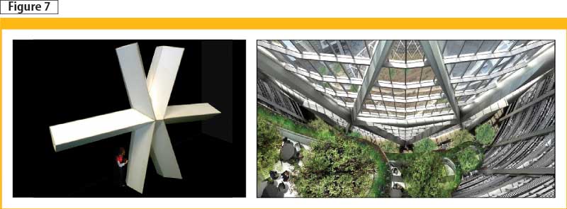 The atrium screen wall was a very dramatic element in the architectural design as it was exposed to all building users. Structurally, the wall was important as the diagonal grid was involved in completing or closing the perimeter lateral load-resisting system. Complicating the screen wall’s structural aspects was the large, unsupported length of the compression elements and the the screen wall’s tendency to attract gravity load from adjacent floor plates (Figure 6).