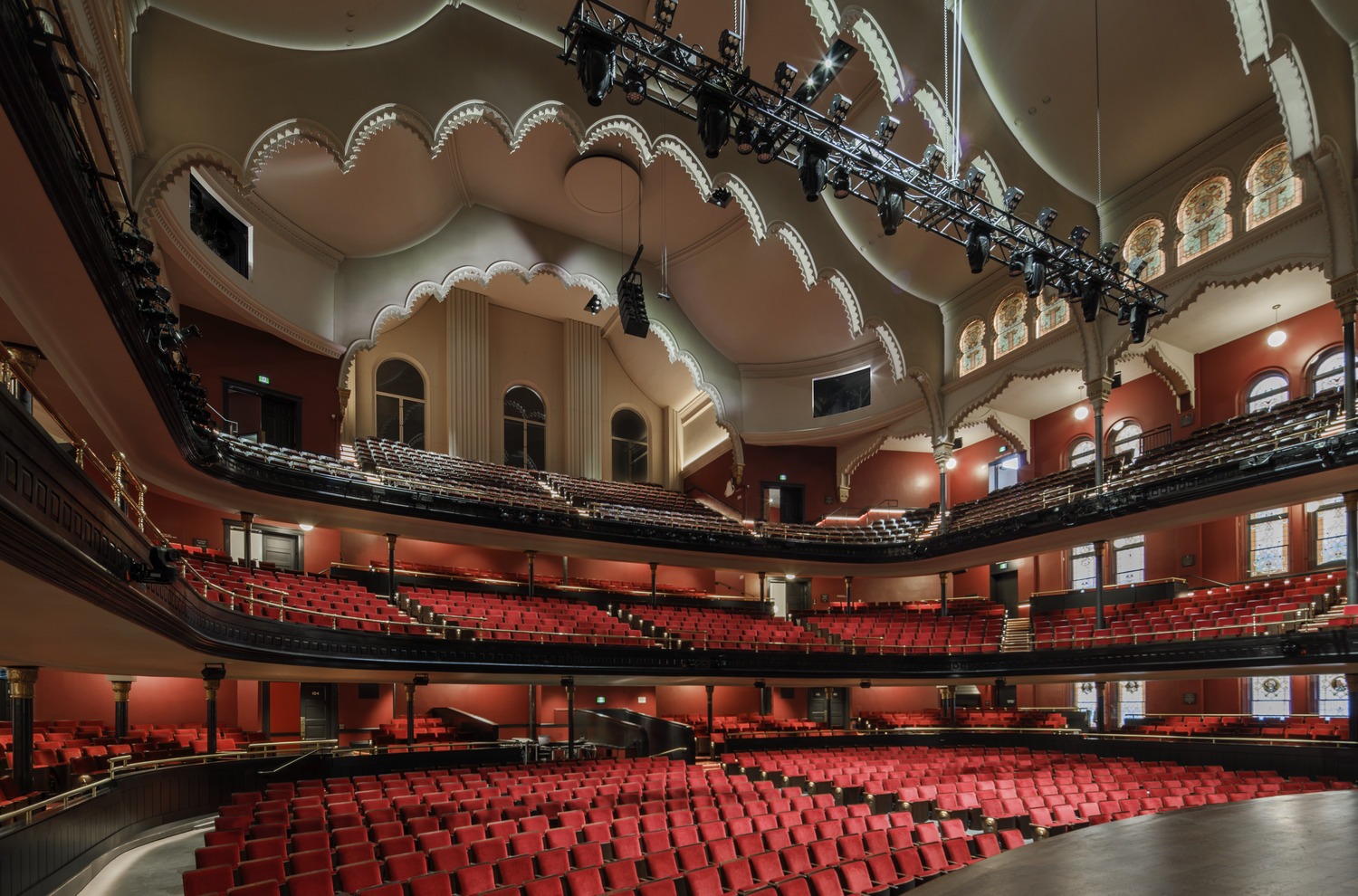 The interior of the hall underwent meticulous renovation, with special care taken to retain the building’s character-defining features, including the original ceiling, cast-iron columns, and wood-panelled balcony balusters.