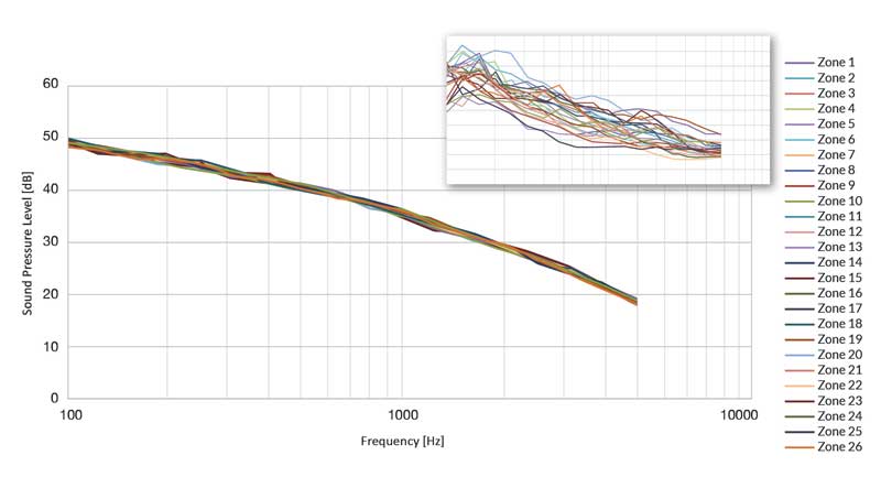 The study of architectural acoustics demonstrates the physics of the behaviour of sound within the built environment is exceedingly complex—and this is true for any sound, even those introduced via a sound-masking system. Regardless of the sophistication of the technology, the system’s layout or loudspeaker orientation (e.g. upward-facing within the plenum or downward-facing using cut-throughs), the masking effect can only be achieved through skilled field commissioning—or “tuning”—which adapts the sound actually produced in the room/space by accounting for its architecture and fit out. Small zones (i.e. no larger than one to three loudspeakers in size) offering fine volume (in 0.5 dBA steps) and frequency (1/3-octave) adjustment capabilities provide the technician with frequent and precise control points across the environment, helping to consistently achieve the masking effect throughout the space and, hence, a better outcome for the occupants.