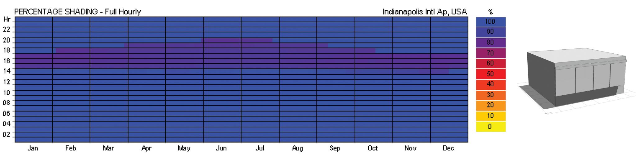 Since the model has a west-facing elevation, all the sun exposure is in the afternoon; further, since the sun sets earlier in the winter, exposure is much greater during summer months. Incorporating a range of exterior shading devices into the model gives the results seen in the graphs within this article.