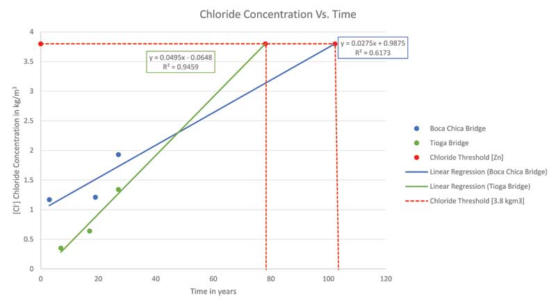 Based on coring of two bridge decks in different exposures, as indicated in Figure 1 (page 29), the chloride threshold for the galvanized rebar is not reached until year 78 and 102 for a bridge in a northern climate (Tioga bridge, Pennsylvania) where road salts are used and for a bridge in a southern climate (Boca Chica bridge, Florida) with marine exposure, respectively. Conversely, the chloride threshold for black/bare bar would be reached sometime around 10 to 15 years after the concrete pour (Figure 4).