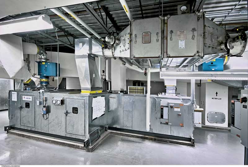 The energy recovery ventilation units for this project achieved 76 per cent efficiency on energy recovery. Another improvement in this building regarding energy efficiency is its demand-controlled ventilation in meeting rooms. In these rooms, CO2 sensors on the wall monitor the number of people in the room and increase or decrease the amount of fresh air brought into the space accordingly. This not only saves energy by providing a decreased ventilation rate when the rooms are not in use, but improves indoor air quality (IAQ)—especially when a meeting room is full.