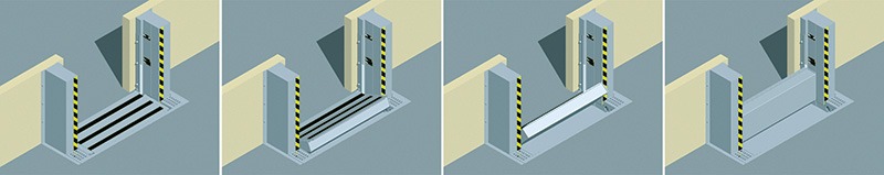 Manual containment barriers are a newer development that offer a practical and cost-effective way to retain polluting fluids. Their chemical-resistant gaskets maintain a tight seal in both hot and cold conditions, and the rigid steel and aluminum design withstands extreme temperatures during fire. A unique clamping mechanism secures the barrier in place between pre-set piers installed at the opening, which eliminates the need for ramps or berms. They work well for protection in areas with less frequent traffic and few pedestrian or vehicle doors to protect, such as warehouse storage zones or secondary access points. Indoors, without traffic, the barriers can remain horizontal and avoid possible leaks. Various styles and sizes of manual spill control barriers are available, including manual insertable, pivoting, loading dock barriers, and step-ramp style barriers. The barriers can be deployed and then removed, making them suitable for temporary use during maintenance operations or in areas that do not face constant risk, and are less intrusive because they do not require the extensive site preparation needed for automatic systems. Due to their manual nature, they require personnel to be on-site to activate them, which may not always be possible in emergency scenarios. They are a practical decision for facilities that need occasional spill or flood protection without the need for continuous readiness.