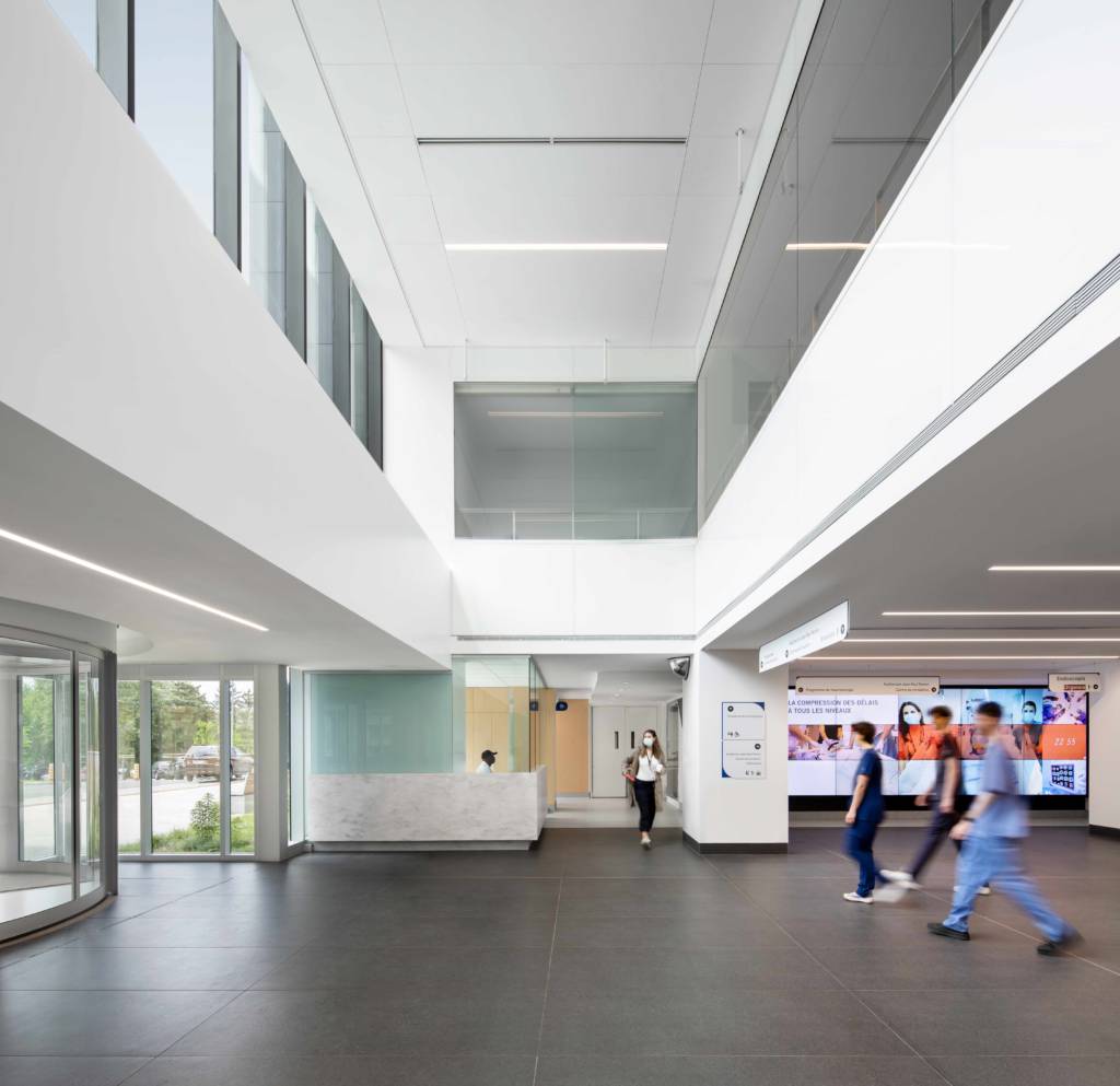 Hopital du Sacre-Cœur-de-Montreal’s (HSCM’s) L-shaped addition to its historic building borrows the masonry of the original building and combines it with a modern curtainwall system to maximize access to natural light.