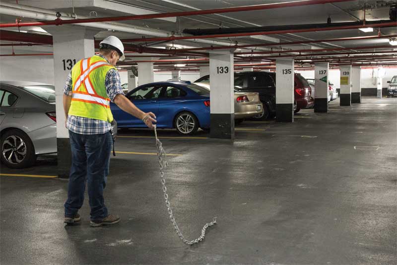 A chain drag survey is a technique used to locate hollow sounding areas on the suspended slab surface. However, it does not provide information with respect to the type of deterioration detected (Figure 2). The hollow sounding areas detected may be a result of concrete delaminations caused by the corrosion of the embedded reinforcing steel in the structural slab or due to the separation of the moisture protection system from the surface of the suspended slab. Similar to the chain drag technique acoustical sounding of the vertical concrete elements and suspend slab soffit is undertaken to identify the extent of concrete delamination (Figure 3). The principle behind the use of tapping rods/hammers to detect delaminations is similar to that of the chain drag for detecting slab surface delaminations. A tapping rod, when struck against the slab soffit, or a hammer struck against a wall or column, gives off a high-pitched ringing sound if the concrete is not delaminated whereas a hollow sound is heard when delaminated concrete is struck.
