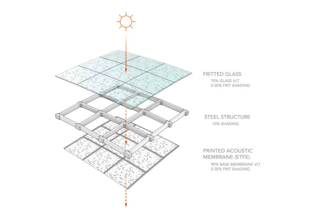 The outer skylight is made up of 1,854 ultra-transparent glass panels, coated with triple-silver solar protection to reduce heat gain, and printed with a pattern of translucent ceramic dots to shade sunlight. The glass has minimal reflectivity to avoid disturbing exterior reflections. The inner layer of the roof is a transparent membrane, micro-perforated to absorb noise and printed with a custom pattern of translucent dots that provide shading, but also glow in the sunlight. The increasing density of dots towards the east and west ends shades low-angle sun, while the centre dome is entirely clear, allowing full sunlight to reach the denser planting in the atrium garden. When seen from below, the overlapping layers of dots create an effect similar to dappled sunlight through the overlapping leaves of a tree, evoking the feeling of being under a tree canopy.