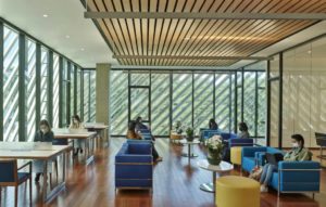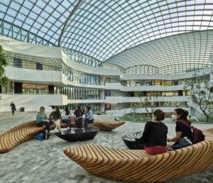 The spacious garden atrium is the physical and symbolic centrepiece of the building. Offering opportunities for spontaneous interaction, collaboration, and discovery, as well as repose and contemplation, it serves as the community living room, visible from almost everywhere in the building. The stepped terraces connect four main levels of activity, a restaurant on the first floor, an amphitheatre and auditorium on the centre levels, and exhibition/event space on the fourth floor.