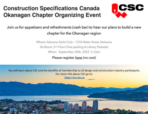 Construction Specifications Canada (CSC) invites you to its September 20 Okanagan chapter organizing event.
