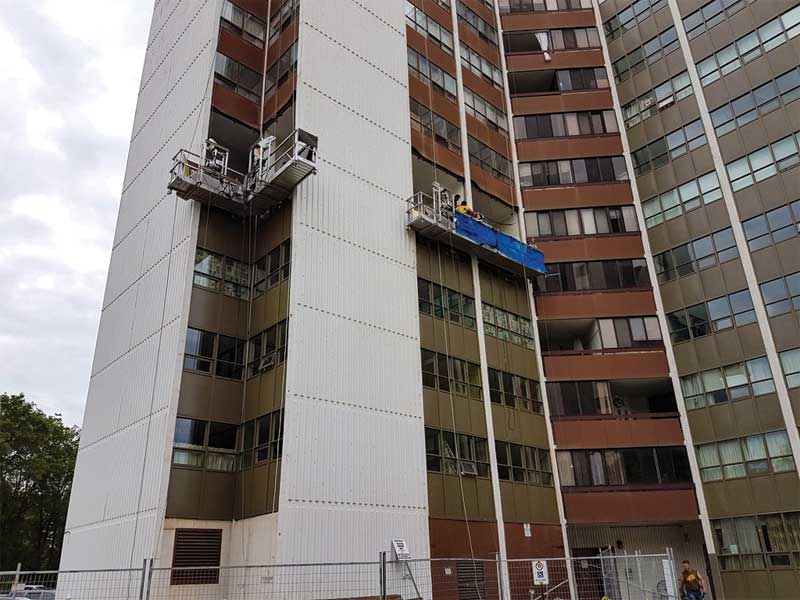 - efficient execution of sequenced work or multiple scopes of work (e.g. balcony guards and slabs, overcladding, cladding repairs, etc.) as all crews are within the same work area and have access to a larger surface area; and