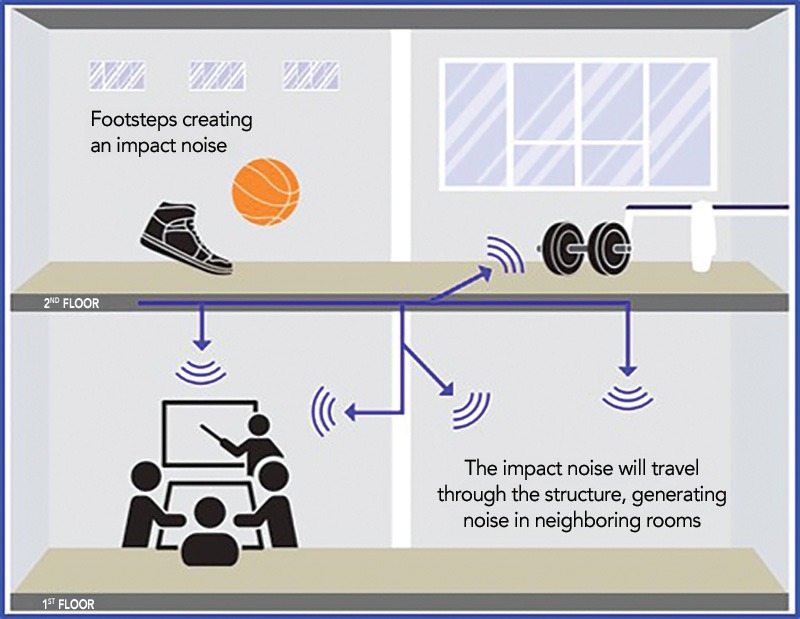 When an object—whether it is a shoe, a chair leg, or a dropped weight—makes contact with the floor, the object’s kinetic energy is redirected. That energy is distributed in several ways: some is returned to the object (bounce), some is transformed by the floor (heat), and some is transmitted as noise into the same room or adjacent spaces. Because the relative amounts of heat and transmitted noise are proportional to the mass and damping of the floor-ceiling assembly, the building materials therein are of critical importance.3 In other words, the floor can help manage how and where the energy goes.
